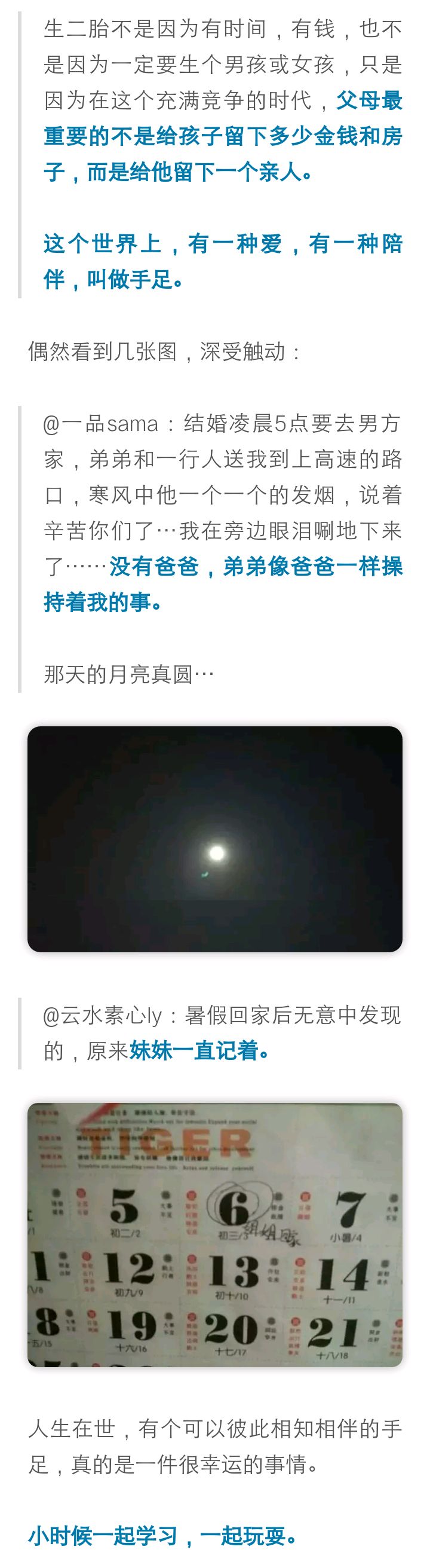 不是因为有时间,有钱,也不是因为一定要生个男孩或女孩,只是因为在这个充满竞争的时代,父母最重要的不是给孩子留下多少金钱和房子,而是给他留下一个亲人。