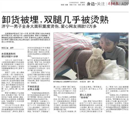 “幸福的家庭总是相似的,但不幸的家庭各有各的不幸”。在经过近一个月的重症监护室稳定后,贾荣飞的生命体征终于平稳下来。5月10日下午,贾荣飞在帮朋友给水泥厂拉料的时候,突然发生了意外,在卸货过程中,不慎滑倒,下肢被埋在高温水泥熟料中6、7分钟,全身60%三度烫伤,急性肾衰竭的他几次徘徊在死亡边缘,如今生命体征回复平稳,暂时从死亡线上得以逃生,但后期巨额的医疗费成为了压在家人心中的巨石,怀孕4个月的妻子每天在病床前安慰着丈夫……