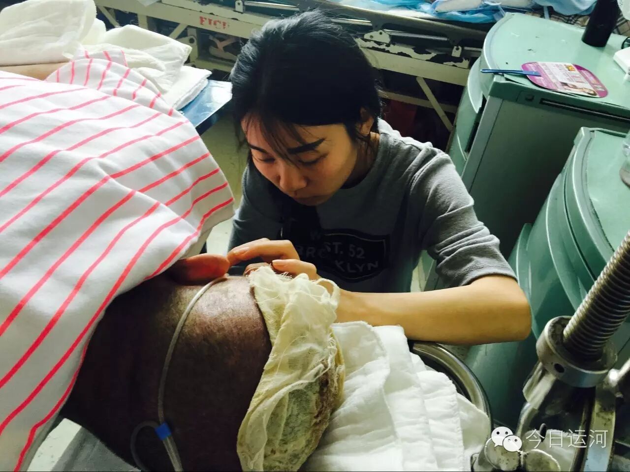 换药了,这是一家人最揪心的时候,一层一层揭开纱布,刚刚长好的一些伤口又被揭开,传来的是贾荣飞撕心裂肺的喊叫。爸爸贾明喜给他嘴里塞上毛巾,用手紧紧撑住他的头,妻子贾真真伏在他的耳边,一遍又一遍的鼓励他“再撑一会儿、坚持住、撑一会就好了……”短短的换药时间好像一个世纪那么漫长,妻子已经背过身去,双手紧紧的攥住衣角,强忍着不哭出声来。
