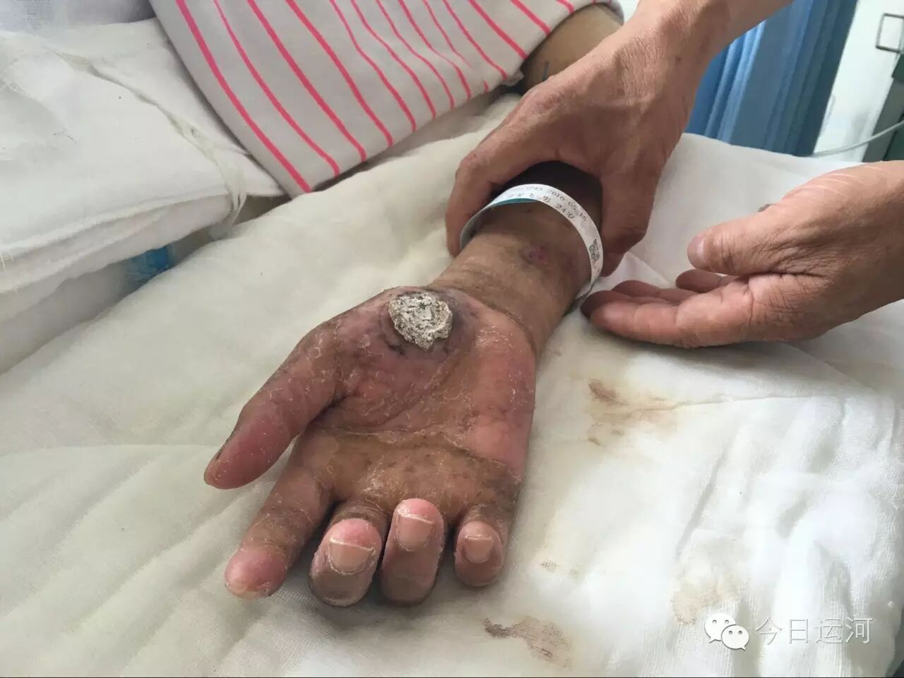 记者注意到,从贾荣飞的腰部以下全部被烫伤,皮肤溃烂不堪。“儿子身体的各个脏器,像肾脏、脾脏、胃肠等也出现衰竭,还需要做血透。”说起儿子,这位今年54岁的汉子也忍不住哽咽,眼睛充满了红血丝,自从孩子出事后,这位父亲还没有睡过一个完整觉。
