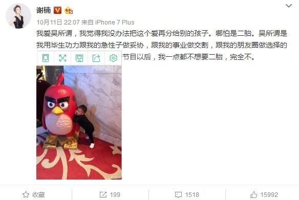 随着二胎政策的放开,很多明星夫妻都赶着生二胎,但昨日吴京老婆谢楠发微博直言自己不想要二胎,理由戳中很多妈妈的心......