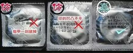 正品:外盒包装印有生产厂商、经销商名称、地址、电话,生产许可证、卫生许可证、批号、有效日期、避孕套的描述、数量、标准宽度、储存条件等等。印有"CCC"标志,有的产品还印有防伪标识。