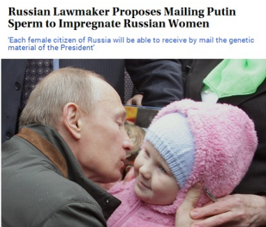 ●战斗民族也是太彪悍了,俄罗斯一个议员向国会提出法案,要求把普京的精子邮寄给全国妇女,让大家怀上“小普京”,成功的女性将获国家津贴,“小普京”们都会就读特别学校,接受军事训练等各种训练,确保普京大大的基因……