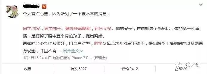 昨天,在微博上看到了一名上海网友发的帖子,讲述的是一个很不幸的故事:同学28岁,家中独子,确诊肝癌晚期。他的妻子,在得知这个消息后,第一时间去医院打掉了腹中五个月的孩子,并跟他提出离婚。