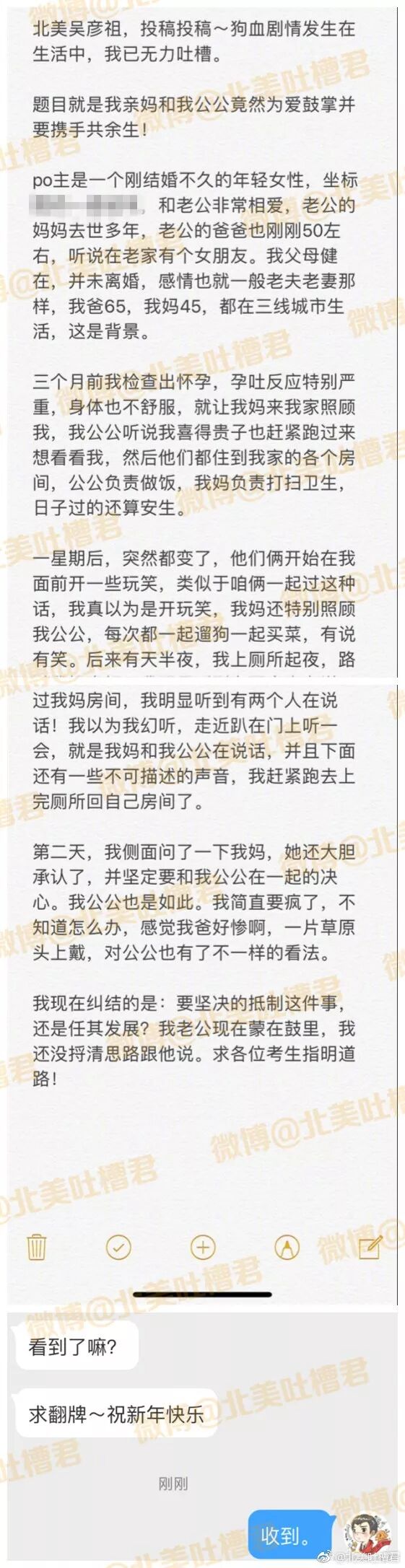 瓶子里的情话:如果po爸对po妈好的话,就劝po妈别犯傻了,一把年纪了还不懂得为家里人考虑,一个星期的相处就忘记了和老公二十多三十年的感情,不被祝福的关系是不会长久的~