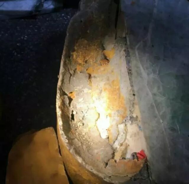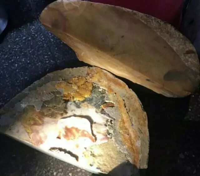 第一层用很差的皮做开窗的部分,是为了确保用强光灯照的时候,打灯时有表现,再下来一层,是一块完全不相干的石头拼接起来,里面还有水泥的痕迹甚至还有螺丝钉都被粘在里面,李某现在哭都哭不出来。