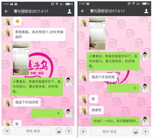 曹女士在网上咨询不孕时,偶然看到武汉送子鸟医院报喜案例,其中有一个还是自家这边的不孕患者,心里既欣喜又害怕。抱着试试看态度2017年5月17日来到了武汉送子鸟孔丹主任处就诊。