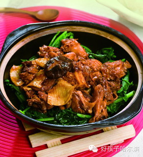 4、菠菜放在沙锅中铺底,将炒熟的鸡块倒入即可。
