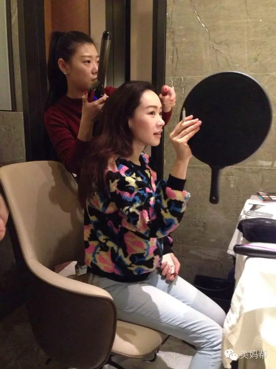 妈卡辣妈与工作人员一起看录制效果~~✪ω✪
