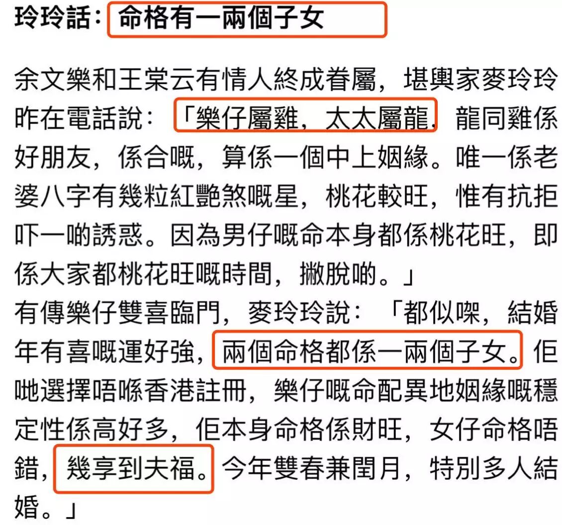 香港堪虞学家麦玲玲也说,王棠云面相旺夫,和余文乐天生一对,将来还会有儿女双全。