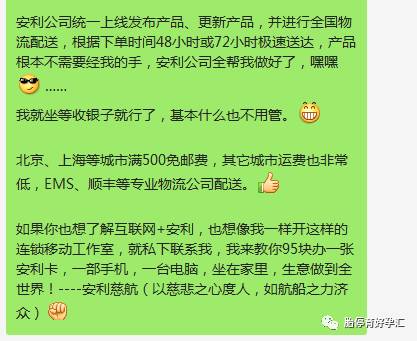 安利移动工作室,95块代理国内350+国外200多款产品,安利公司正品授权,工作室全自动管理运营,客户下单安利公司直接全国统一配送,我们什么也不用管,坐等收银子即可,加我微信1852533597,来详细了解,说一定以后我们有缘成为合伙人呢,一起通过移动互联网+安利低成本业余创业,并实现时间自由和财务自由,零开支,不东奔西跑,一部手机经营,兼顾家庭,兼顾生活,兼顾事业,可加QQ或微信1852533597详细了解。