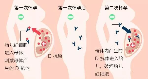 这是因为胎儿红细胞经胎盘失血进入母体循环中,被母体脾脏的巨噬细胞所吞噬,经较长时间才能释放出足够量的抗原,此抗原抵达脾脏淋巴细胞的相应抗原受体而产生Rh抗体,此种初发免疫反应发展缓慢,常历时2个月以上甚至6个月,所产生的抗体常较弱,并系IgM性质,这种IgM抗体分子量较大是五聚体,不能通过胎盘。第一胎娩出时仅处于初发免疫的潜伏期。当发生原发免疫反应后,再次怀孕,即使经胎盘失血量很少亦能很快地发生次发免疫,而且产生的抗体是IgG性质的抗体并迅速上升,这种抗体是唯一能通过胎盘的抗体。所以如果RhD阴性女性有过输血史或妊娠史,就有可能会产生RhD血型抗体,产生抗体的概率大概是2/3。这些产生了RhD抗体的女性如果再次怀孕,抗体就会通过胎盘进入胎儿的血液循环,如果宝宝是个RhD阳性宝宝,就会破坏胎儿的红细胞,与胎儿红细胞发生抗原-抗体免疫反应,使胎儿红细胞受到破坏,出现不同程度的溶血,也就是出现大家熟知的母婴血型不合引起的胎儿或新生儿免疫性溶血性疾病。这种疾病的严重程度可能导致孕妇流产或胎儿水肿、肝脾肿大、贫血、黄疸,如果产生核黄疸可引起严重后遗症,甚至死亡。