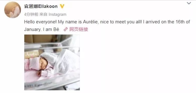 昨天晚上,官恩娜在社交网上分享了一张婴儿睡在床上的照片,宣布小女儿已经出生了!她写道:“大家好!我的名字叫Aurélie,很高兴认识你们。我在1月16日出生,我是BéBé G的妹妹。”床上的小女儿睡得非常香,不知道她有没有听见爸爸妈妈那喜悦的笑声呢?