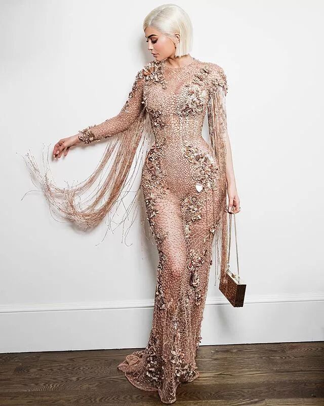 Kylie的礼服造型,也是相当的个性大胆,水晶珠宝加身,编织式的透视长裙,好身材看的见,还有一头抢眼的金色短发。