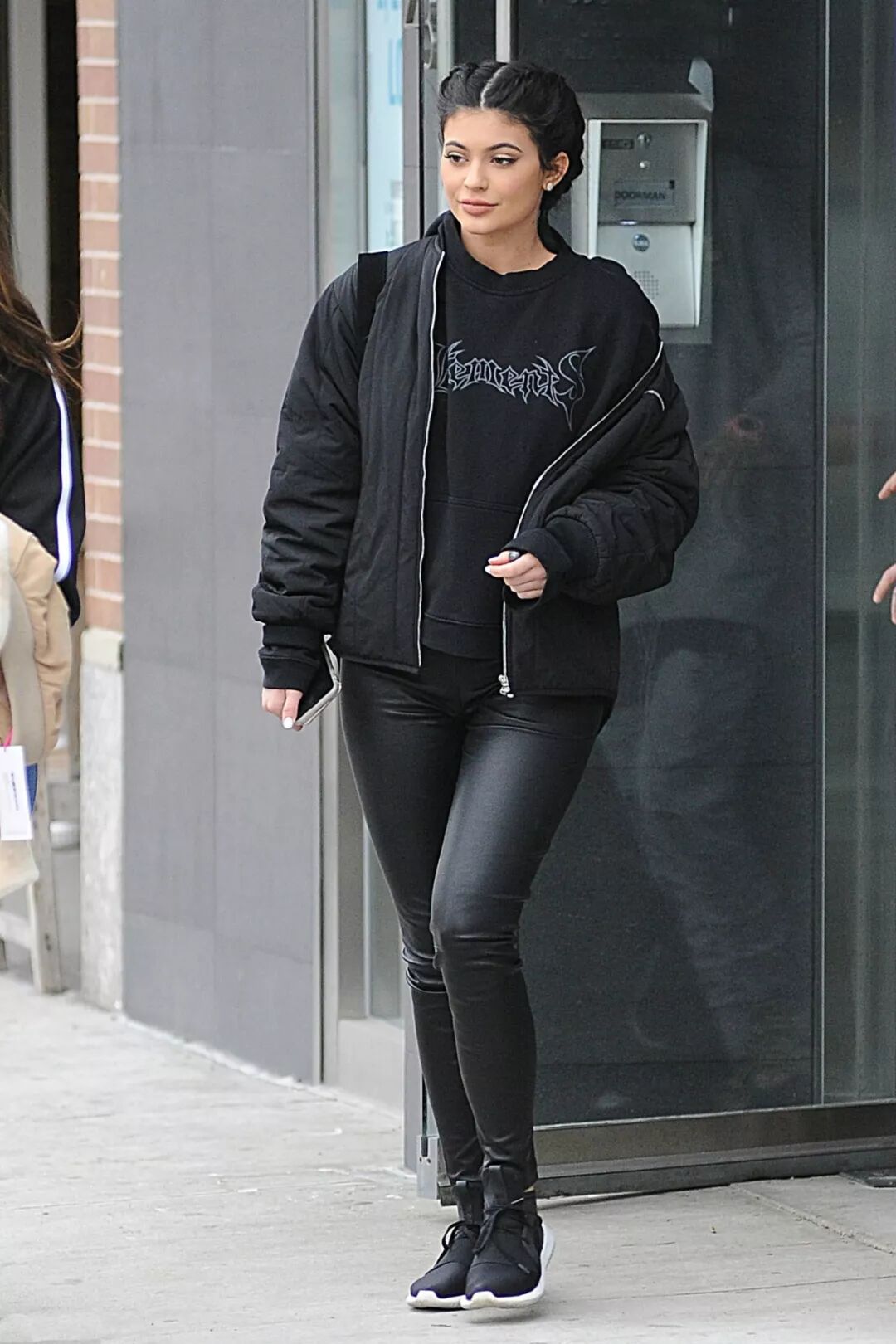 All black的运动搭配,没有运动裤,而是用皮裤和卫衣,以及飞行员夹克搭配,舒适的同时也有街头风的时尚感,酷酷的女孩可以尝试这样的穿搭。
