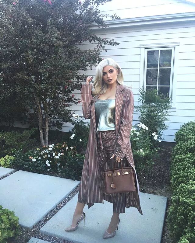 条纹的休闲套装,金色的内搭和细高跟鞋,很成熟的搭配,甚至可以说是职业女性的party时尚,这样的穿搭很难让人想象Kylie 只有18岁。
