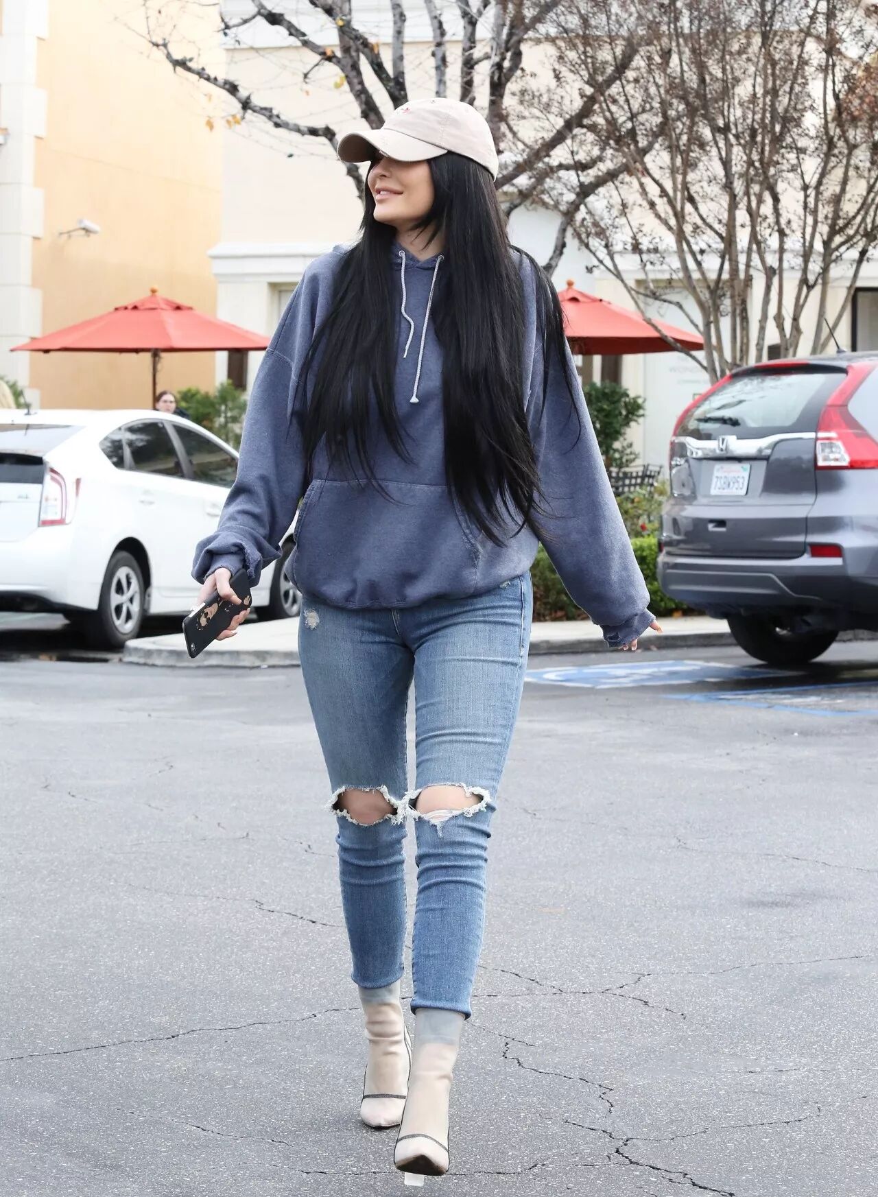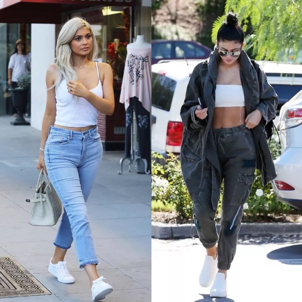 毕竟是青春的18岁,Kylie 的日常穿搭中,简单的基本款,牛仔裤,运动服和小白鞋的搭配也是很多,当然随时随地露腰的时尚,也是她时尚的一部分。
