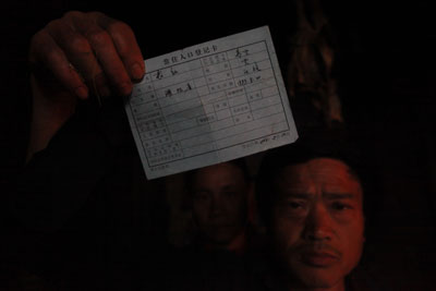 大石村的袁名友向记者展示他家的户口簿。户口簿上还有被抢走的女儿袁红的名字。