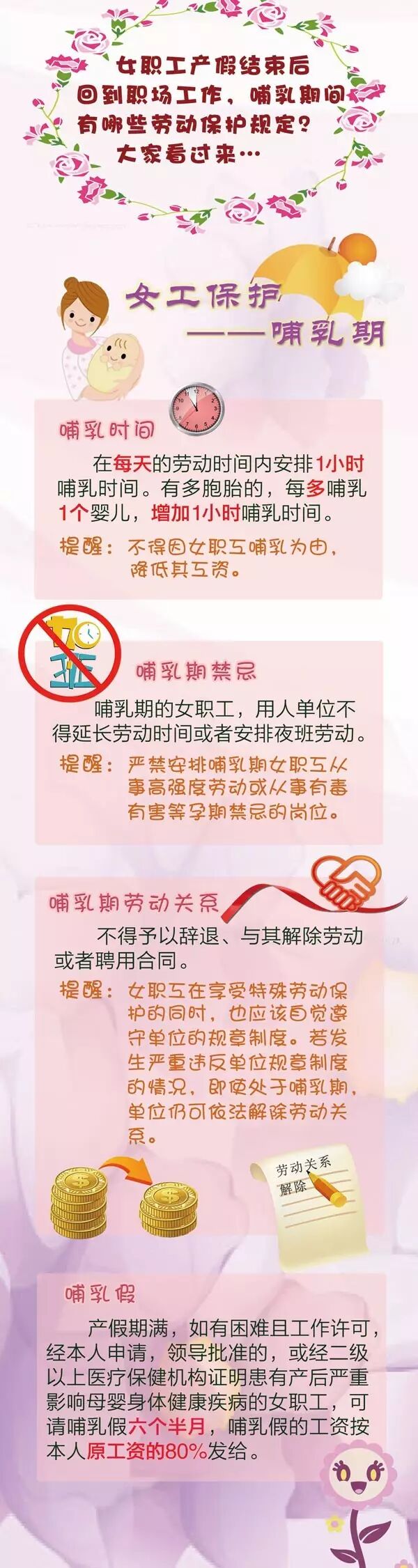 在婴儿一周岁内每班照顾授乳。(每天劳动时间内安排1小时哺乳时间;生育多胞胎的,每多哺乳1个婴儿每天增加1小时哺乳时间。)