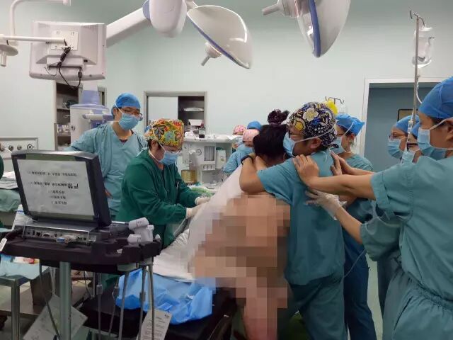 12月13日,一组医护人员为体重280斤的二胎妈妈实施剖宫产手术的图片在湖南省人民医院职工微信群引发热议。