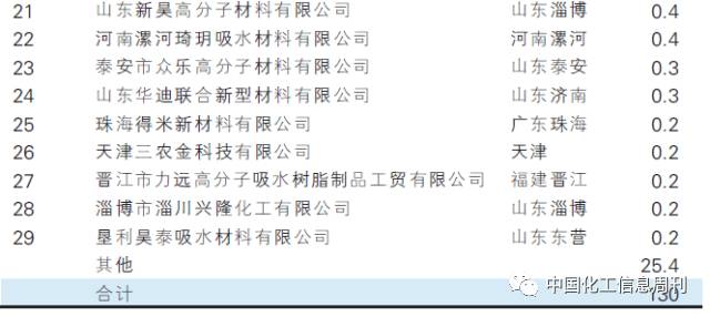 从表2可以看出,中国SAP生产企业众多,除了排名前几位的独资或合资企业,以及卫星石化和万华化学等公司之外,其他产能规模普遍较小,产品质量不高,竞争力偏弱。