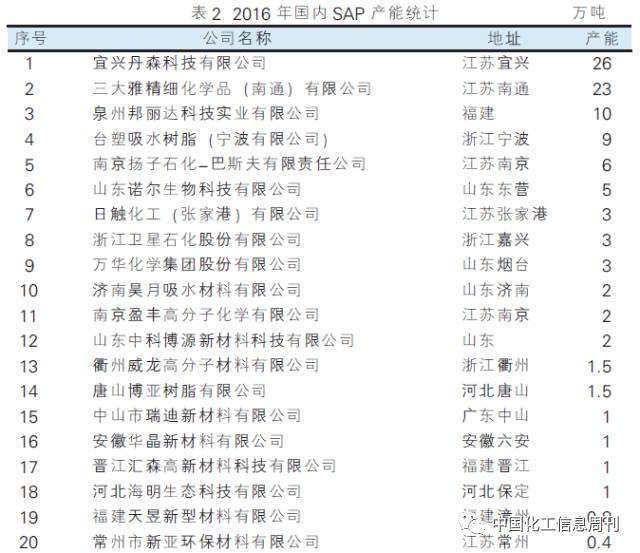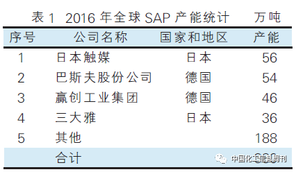 截至2016年,全球SAP产能约380万吨,产量约260万吨,消费量约240万吨,其中67%的全球产能集中在亚洲。