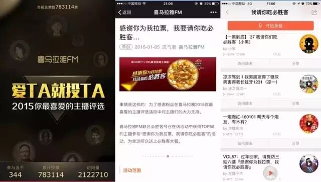 还有一种,就是内容植入,这里面也包括前面提到的口播广告语,但也是有其他玩法的。例如必胜客就和喜马拉雅FM曾发起过一次“2015你最喜爱的主播评选”活动,以此为切入点,利用平台主播有意感谢粉丝支持的角度,发起了《感谢有你,必胜客请粉丝吃大餐》活动,赞助喜马拉雅FM平台前50名主播的大餐宴请。