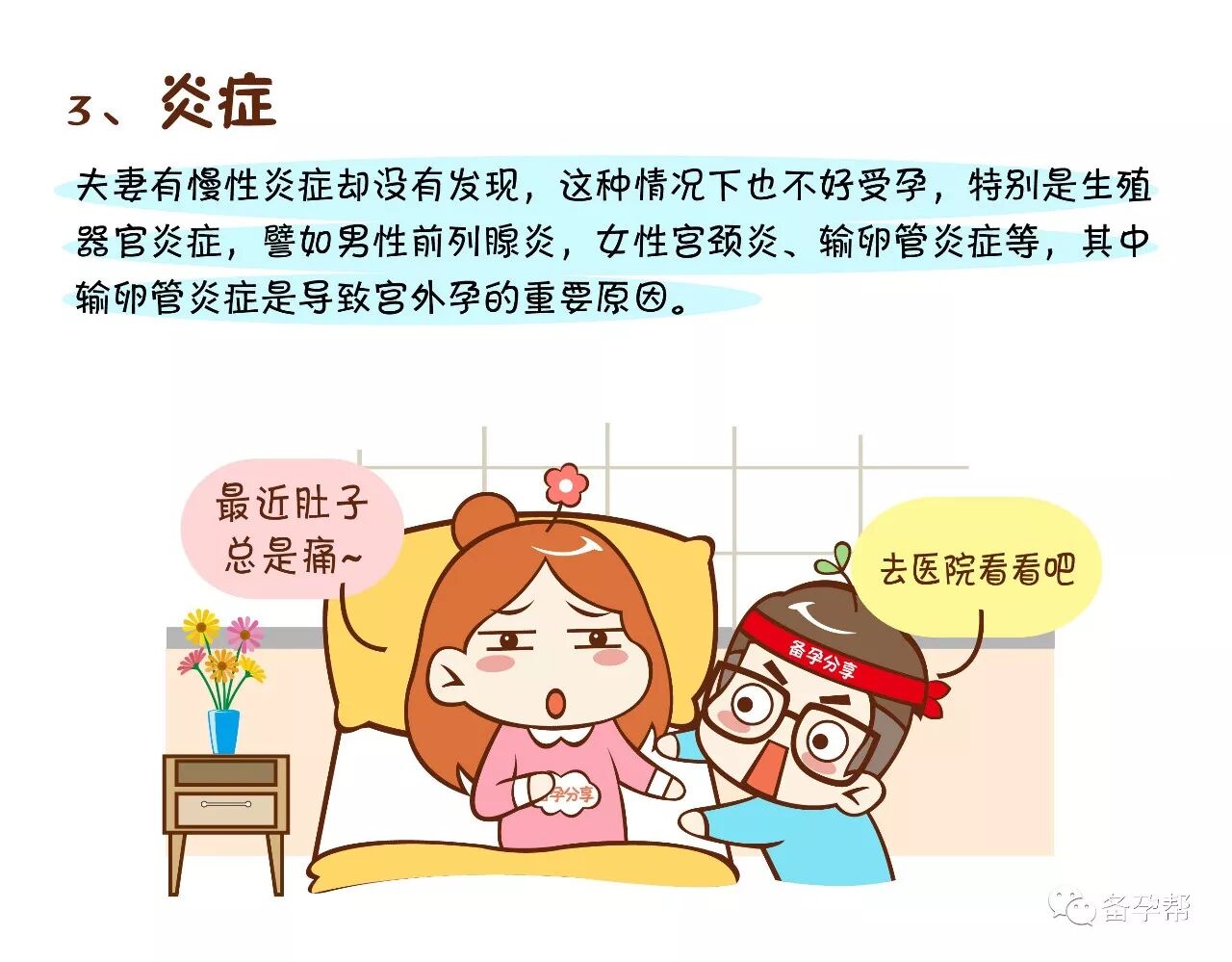 夫妻有慢性炎症却没有发现,这种情况下也不好受孕,特别是生殖器官炎症,譬如男性前列腺炎,女性宫颈炎、输卵管炎症等,其中输卵管炎症是导致宫外孕的重要原因。