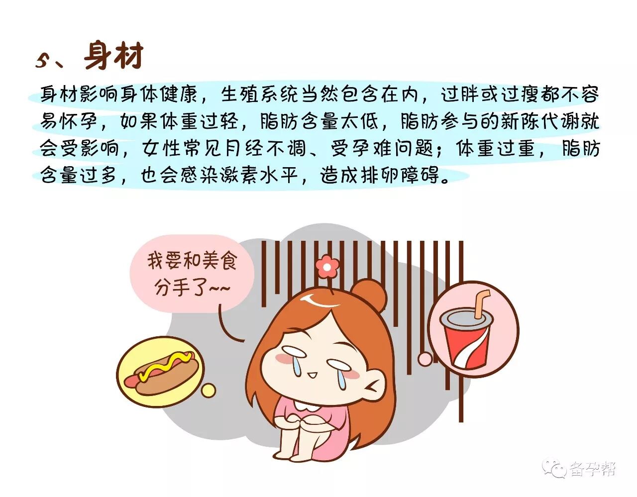 身材影响身体健康,生殖系统当然包含在内,过胖或过瘦都不容易怀孕,如果体重过轻,脂肪含量太低,脂肪参与的新陈代谢就会受影响,女性常见月经不调、受孕难问题;体重过重, 脂肪含量过多,也会感染激素水平,造成排卵障碍。