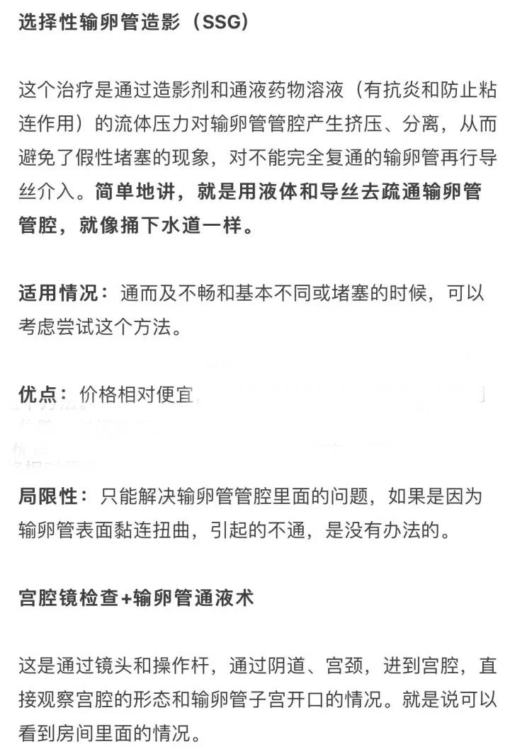 缺点:就是需要住院。关键的是,这几种治疗方法,只能解决输卵管通畅问题,而且手术后最佳受孕时间是6-12月,再久,可能又会黏连扭曲堵塞起来。
