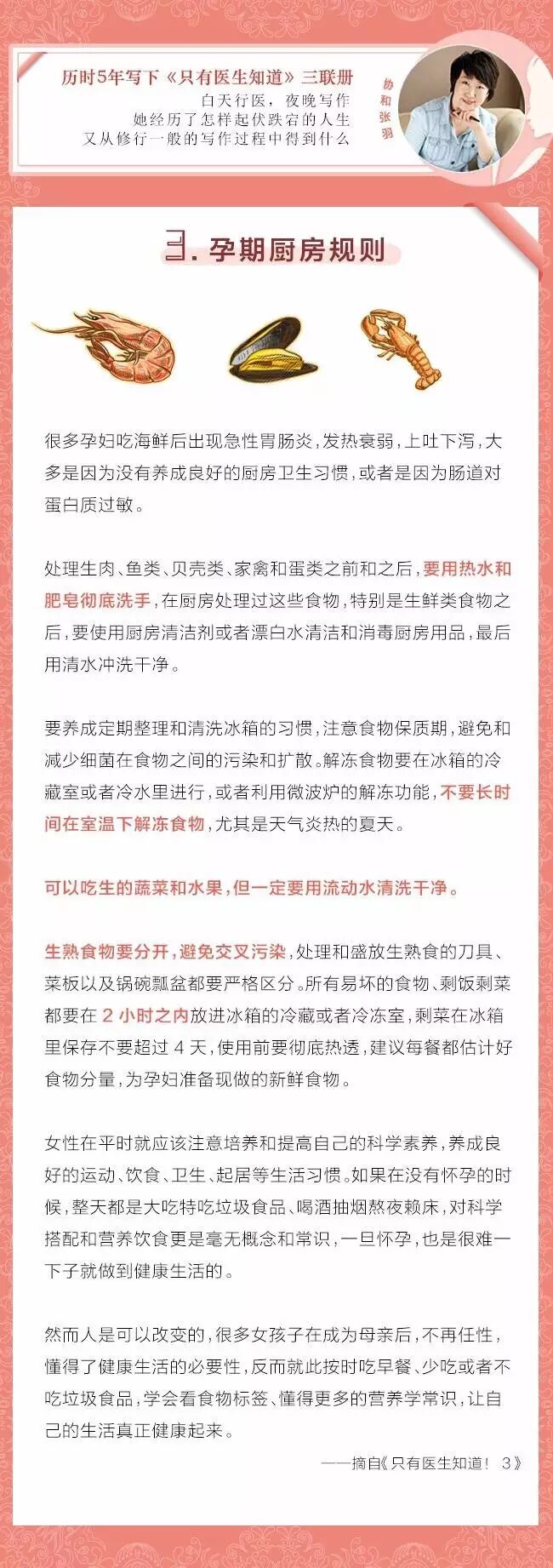 事实的确如此吗?面对吃的问题,虽然大致可以总结为“没毒的东西都能吃”,但是由于环境污染、重金属残留、细菌病毒寄生虫等问题,有些东西还真的不能多吃,有些东西最好不吃,有些东西千万别吃。吃是一件很重要的事,掌握了孕期吃什么,如何吃,有哪些必须遵守的厨房守则,有哪些绝对和相对禁忌,还能一直坚持做,那么不只在孕期,女性长长的一生还有她的家人都会受益。