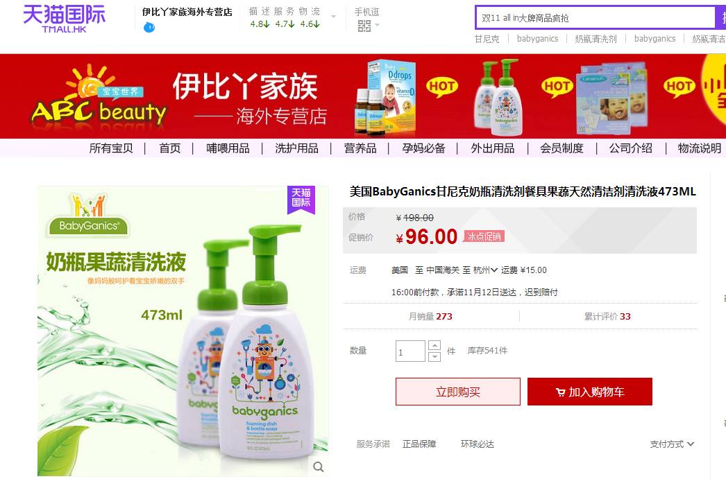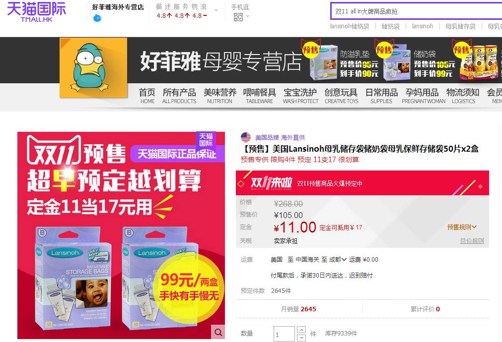 【购买渠道】天猫国际双11预售款,现在交定金,双11当天补齐尾款要划算一些,伊比丫家族海外专营店。