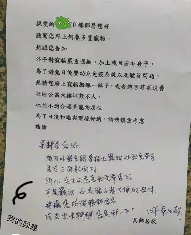 “某邻居您好,海内外医生报道指出,宠物对胎儿发育是有正面影响的。所以,真正会危害胎儿发育的,不是宠物,而是脑子装大便的母体。建议您挂个脑科看看。或者出来聊聊,您是哪一户?”