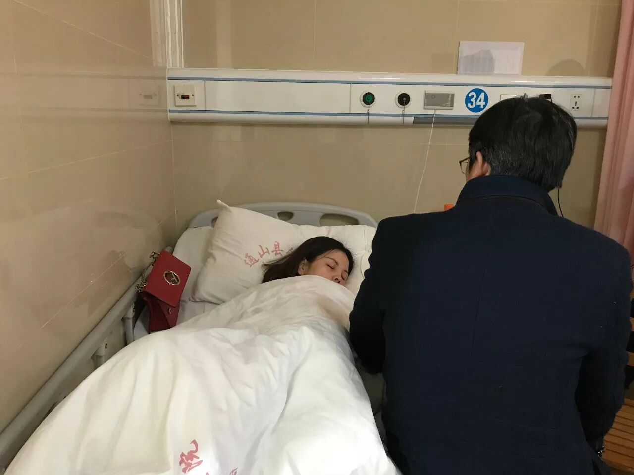 通山县人民医院妇科病房内,被打的护士朱女士躺在病床上,许多亲友和同事前来探望。