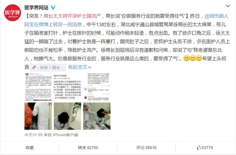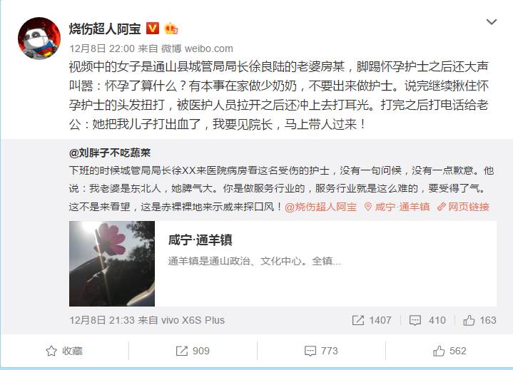 12月9日上午,微博医疗自媒体“烧伤超人阿宝”微博转发“局长太太将怀孕护士踢流产”新闻,引发社会关注。