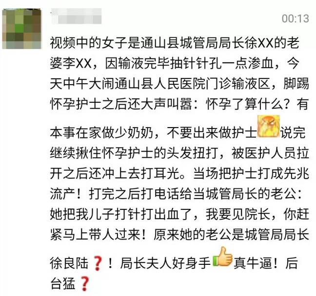 据悉,12月8日中午13时左右,湖北咸宁通山县城管局某徐局长的太太房某,带儿子在输液室打针,护士在拔针的时候,可能动作稍未轻柔,有点出血。有了些许口角之后,徐太太猛的一脚踹了过去,对着护士就是一阵暴打,踢完肚子之后,紧抓护士头发不放,多名医护人员上前阻劝也不肯松手,导致护士流产。徐局长到现场后没有道歉和问候,却说了句“我老婆是东北人,她脾气大。你是做服务行业的,服务行业就是这么难的,要受得了气”。