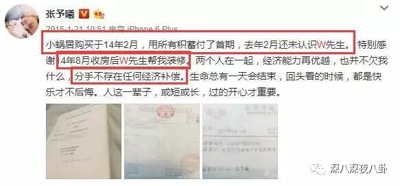 曾经被质疑分手费是一套房,妹子也大方发微博澄清,表示“W先生很壕,但我只让他赞助了装修”