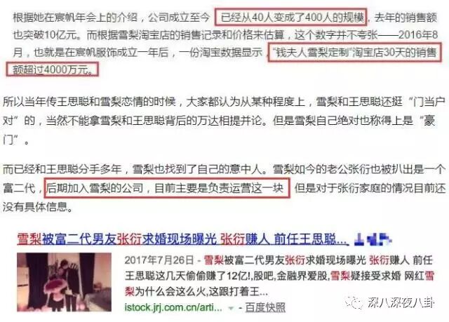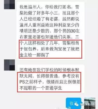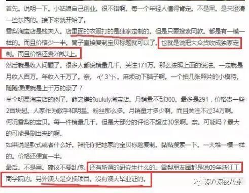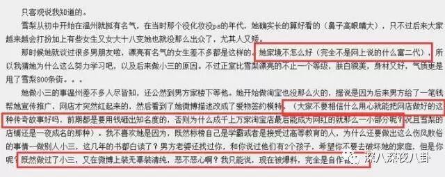 狗血故事hin长,小主高度概括一下。大致就是雪梨当初在温州一直被已婚男包养,某宝店的信誉就是金猪拿钱砸的↓