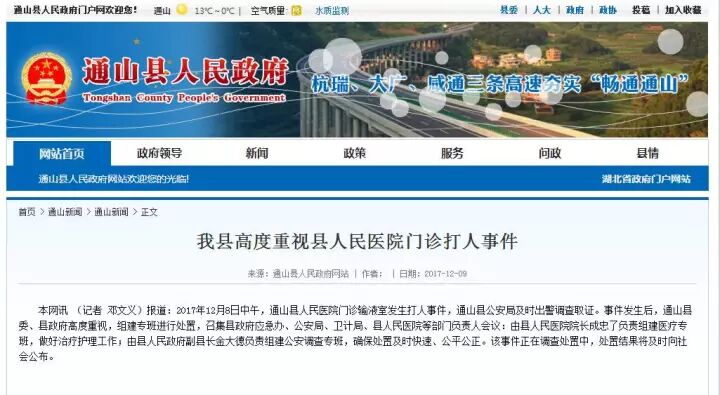 2017年12月8日中午,通山县人民医院门诊输液室发生打人事件,通山县公安局及时出警调查取证。事件发生后,通山县委、县政府高度重视,组建专班进行处置,召集县政府应急办、公安局、卫计局、县人民医院等部门负责人会议:由县人民医院院长成忠了负责组建医疗专班,做好治疗护理工作;由县人民政府副县长金大德负责组建公安调查专班,确保处置及时快速、公平公正。该事件正在调查处置中,处置结果将及时向社会公布。