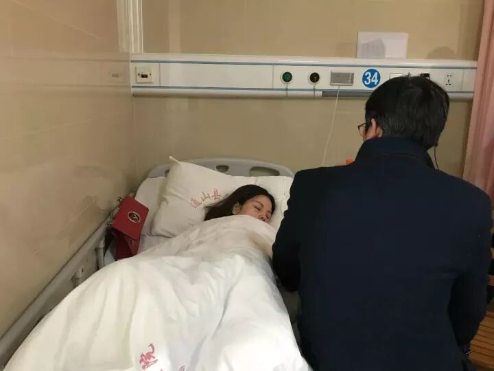 通山县人民医院妇科病房内,被打的护士朱女士躺在病床上,许多亲友和同事前来探望。