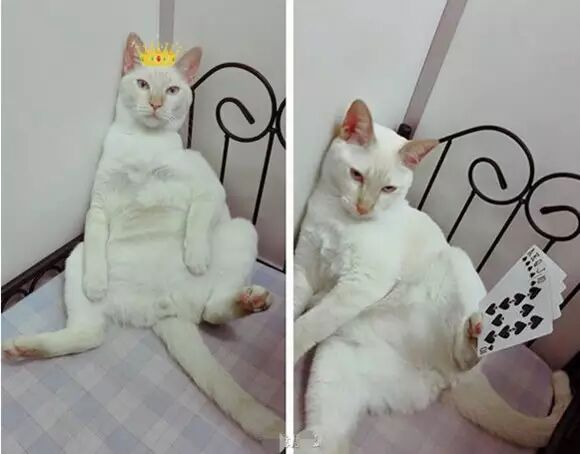 如果你有以为,这是帅气的尊上白子画欧巴,就太过低估我们的主角了,下面这只坐姿不雅,露着菊花(不要脸),带着一副什么都无所谓的表情,脚持超级核弹同花顺的傲娇白猫就是咱们今天的主角——Gaigaiwuwu。它是一名网友一年前捡回来的流浪猫,今年刚刚满两岁
