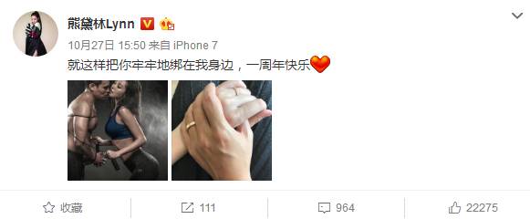 前不久结婚一周年的时候,阿Lynn还晒合照、晒戒指“炫耀”了一番~