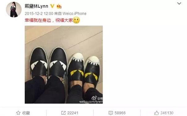图片里男鞋的主人就是她的现任老公郭可颂了,不过当时两人还是男女朋友关系。据说因为这事男友吃醋两人还冷战了一段时间,还好很快就和好如初了。