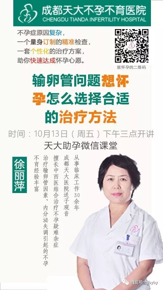 如果您有不孕不育方面的疑问,关注微信后可直接微信在线咨询,或拨打全国免费电话028-85583777详细咨询、添加QQ(4008999777)在线私密问诊。了解更多相关问题,还可点击复制成都天大不孕不育医院手机网站 3g.tdbyby.com 进行详细了解!
