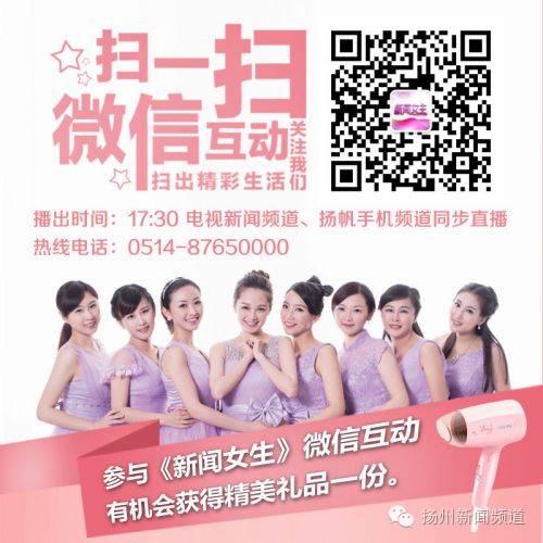 “扬帆”手机频道每天同步直播《新闻女生》,更多精彩扫一扫下方的二维码,关注微信公众号“新闻女生”。