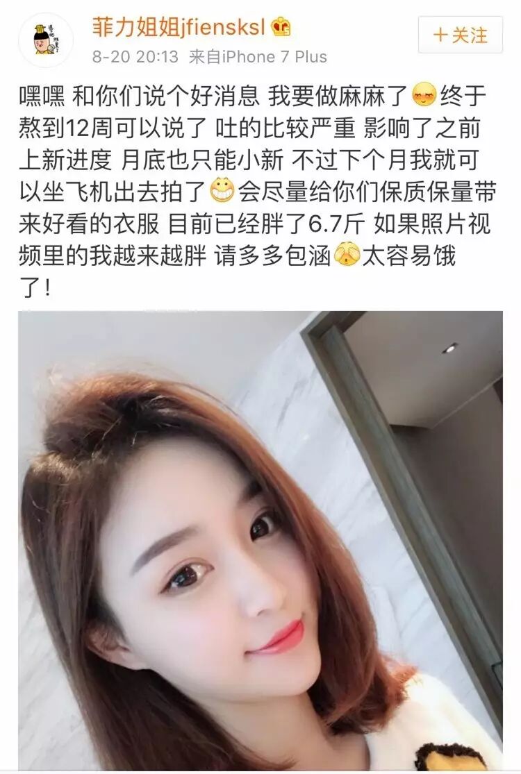 斗转星移,白驹过隙,八月份不经意间,她又在自己的微博小号自曝已经怀孕三个月,孕吐症状比较明显。