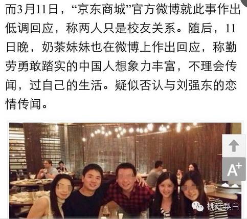 对此,京东商城一面通过官方微博低调回应否认恋情,一面奶茶妹妹用中国人民的想象力疑似回应两人恋情的绯闻。对啊,我们活泼可爱青春的奶茶妹妹怎么可以和有钱大叔在一起!