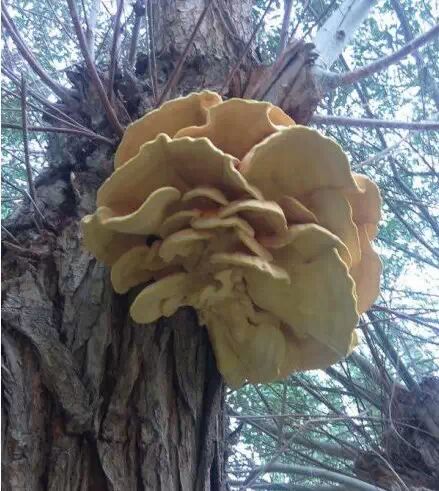昨日,新疆巴州轮台县阿克萨来乡值班干部在该乡卡塔苏盖提村柳树上发现一枚特大蘑菇,蘑菇通体金黄色,呈多层扇形气味浓烈芳香,足有3公斤多,这在当地还是首次发现,或是由于近期雨水较多生长而成。