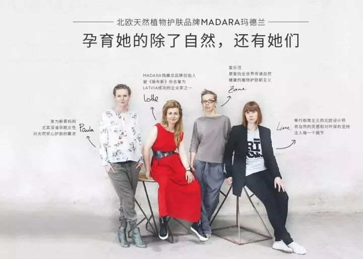 它的创始人Lotte,因一次对于化学护肤品的过敏经历与曾在怀孕期间深受化学护肤品伤害的经历,产生了一个想法“人由自然孕育,为什么肌肤却要承受非天然的化学成分?”于是决定与其他三位崇尚自然生活的北欧女性,将这个想法付诸实践,MADARA玛德兰由此诞生。